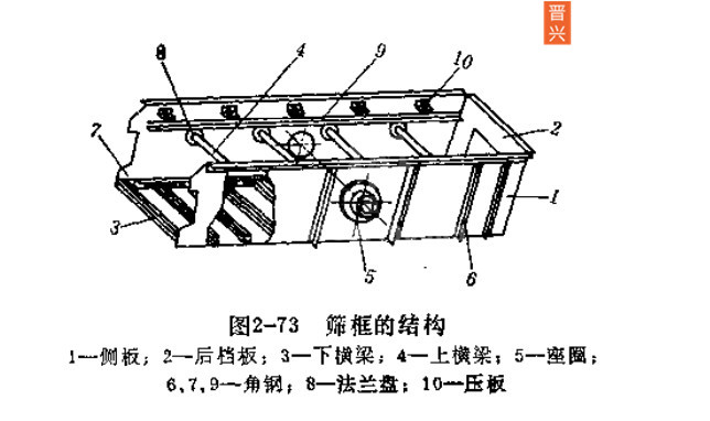 圖2-73是雙層單軸慣性振動(dòng)篩的篩框結(jié)構(gòu)。它是由側(cè)板1、后擋板2、下橫梁3和上橫梁4組合而成。側(cè)板是用鋼板制成,利用橫梁將兩塊側(cè)板連接起來(lái),使篩框成整體結(jié)構(gòu)。側(cè)板用以傳遞激振力,在它的中部,鉚接有座圈5,激振器就安裝在座圈內(nèi)。為了加強(qiáng)側(cè)板的剛度,在座圈附近采用雙層的鋼板,并在適應(yīng)部位鉚接角鋼6以補(bǔ)強(qiáng)。下橫梁采用槽鋼,上橫梁用無(wú)縫鋼管,并用角鋼7和法蘭盤8分別鉚接在側(cè)板上。上層篩面放置在側(cè)板內(nèi)側(cè)的角鋼上,并用壓板10和木楔塊將它固緊。下層篩網(wǎng)放置在下橫梁上,用卡板拉緊(圖2-77)。后擋板中間有能拆卸的后蓋板,供清洗或檢查篩面用。